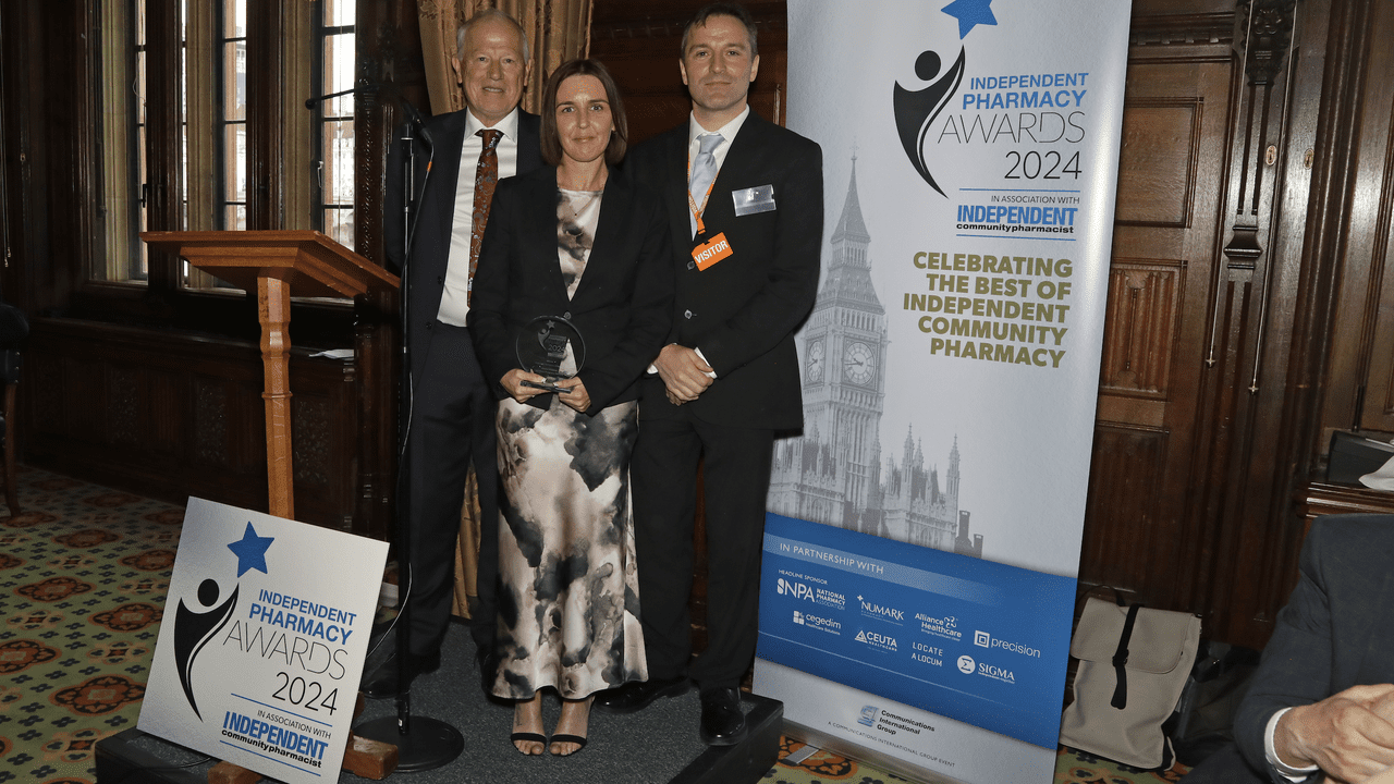 Pictured: Emma Williams is flanked by Matthew Caldwell-Nichols (left), the chairman of Precision Marketing Group, sponsors of the Pharmacy Technician of the Year award, and ICP editor Neil Trainis.