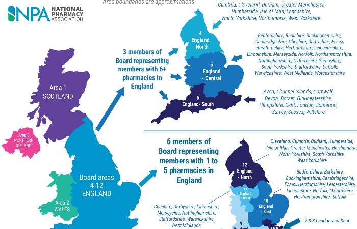 In England, three areas will be elected by members with six or more pharmacies and six regional areas will be voted for by members with one to five pharmacies. NPA members in Scotland, Wales and Northern Ireland will also elect a member on to the Board.