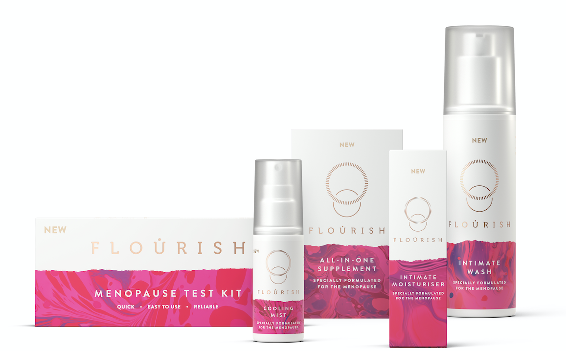 The range includes Flourish Menopause Test Kit (UK first to market), Flourish All-In-One Supplement, Flourish Intimate Moisturiser, Flourish Cooling Mist and Flourish Intimate Wash.