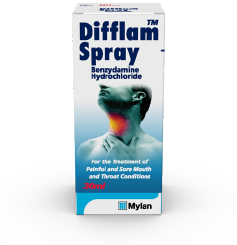 Presentation: Difflam™ Spray contains benzydamine hydrochloride 0.15% w/v. Each metered dose pump spray delivers approximately 175mcl per puff. Indications: Difflam™ Spray is a locally acting analgesic and anti-inflammatory treatment for the throat and mouth. It is especially useful for the relief of pain in traumatic conditions such as following surgical removal of tonsils or the use of a naso-gastric tube; dental surgery. Dosage and administration: Adults and elderly: 4 to 8 puffs, 1½ to 3 hourly. Children aged 6-12: 4 puffs, 1½ to 3 hourly. Children under 6: One puff per 4kg body weight, up to a maximum 4 puffs, 1½ to 3 hourly. Contra-indications: Patients with known hypersensitivity to ingredients. Warnings and Precautions: Not advisable in patients with hypersensitivity to acetylsalicylic acid or other NSAIDs. Bronchospasm may be precipitated in patients suffering from or with a previous history of bronchial asthma. Caution should be exercised in these patients. The small amount of alcohol in this medicine will not have any noticeable effects. Some inactive ingredients may cause allergic reactions. Avoid contact with the eyes. Interactions: None known. Pregnancy and lactation: Difflam™ Spray should not be used in pregnancy or lactation unless considered essential by the physician. There is no evidence of a teratogenic effect in animal studies. Undesirable effects: Serious (frequency not known): Anaphylactic reaction which can be potentially life-threatening. Hypersensitivity reactions. Angioedema (Uncommon): Oral tissue numbness or ‘stinging’ sensations in the mouth may occur which may disappear on continuing treatment. (Very rare): pruritus, rash, urticaria, photosensitivity reaction, laryngospasm / bronchospasm. Prescribers should consult the Summary of Product Characteristics in relation to side-effects. Special precautions for storage: Do not store above 30°C. Do not refrigerate or freeze. Keep out of reach of children. Basic price (UK): RRP 30ml spray £8.49. Marketing Authorization number: PL 60682/0016 Legal category: P.