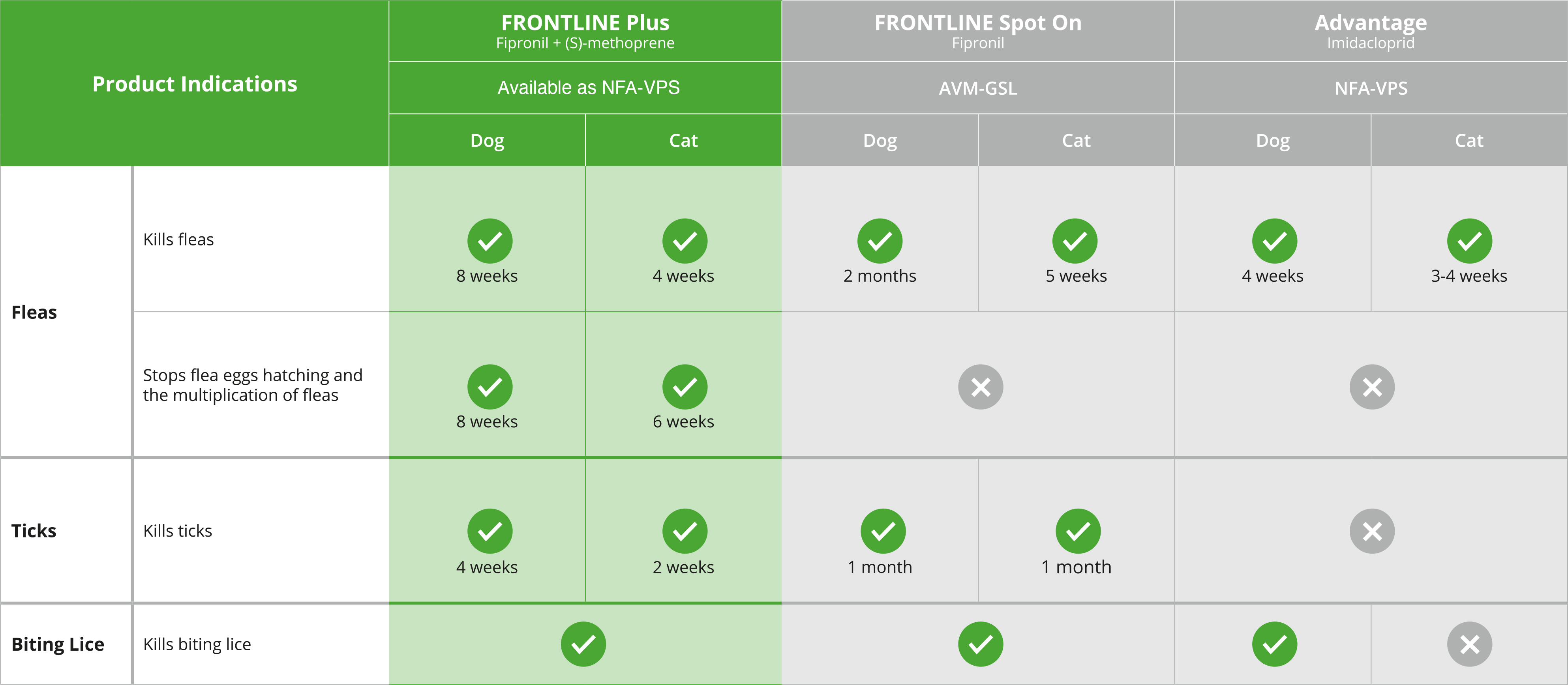 Have a look at the table below for key information about FRONTLINE Plus and other well-known products available