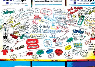 At the Pharmacy Show this year, we asked an artist to create a living wall on the IPF stand. At 9.30 on the Sunday morning our backdrop was blank and our directions to the artist were fairly simply. We wanted her to depict a journey for patients and pharmacists that reflected the challenges they face, but also the solutions that would bring them together in harmony. We wanted people who visited our stand €“ contractors, employed pharmacists, locums, industry people and others €“ to contribute their thoughts to that brief and help to create our living wall.